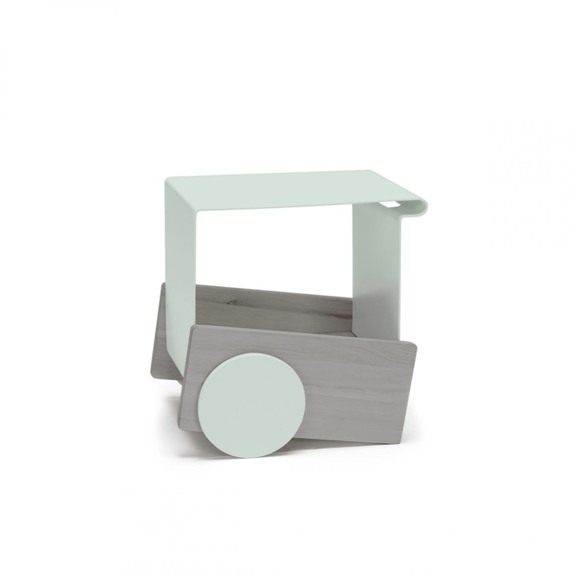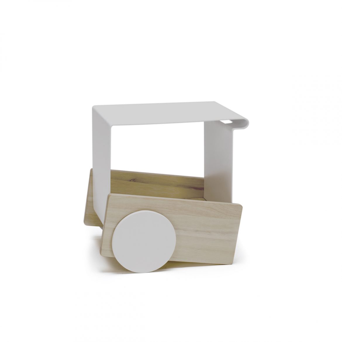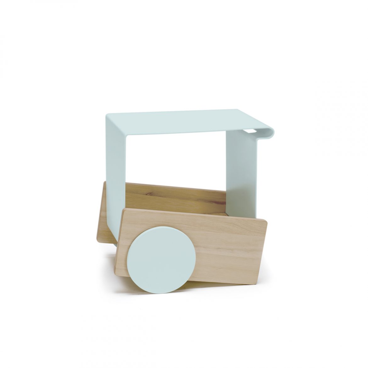 Ein kleiner Beistelltisch mit Stauraum auf Rollen. Er lässt sich überall dort platzieren, wo er gerade gebraucht wird. Und das Beste: Während der Fahrt geht nichts verloren. Should I stay or should I go besteht aus Alublech auf einem Holzchassis mit Holzrädern.
